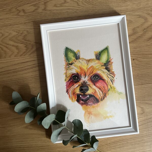 A charming way to immortalize your pet in a memorable, beautiful, unique watercolor portrait. Each portrait is an original work by Katrina Joksta, available in one copy. High-quality materials are used in the painting. Each painted portrait is framed in a beautiful photo frame, so that it can immediately become a beautiful accent in the interior.